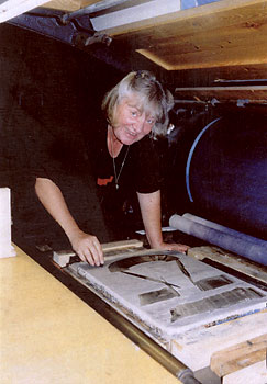 Die Kunst des Lithografierens beginnt mit der Zeichnung auf dem geschliffenen Stein, einer Kalkschieferplatte. Gezeichnet wird spiegelbildlich mit fetter Lithotusche und Kreide. Hat der Künstler den Stein fertig gezeichnet, wird dieser vom Drucker in mehrfachen Gängen weiterbearbeitet: geätzt, gummiert, getrocknet, ab- und ausgewaschen eingewalzt, gepudert, geätzt und wieder gummiert. Erst jetzt ist der Stein druckfertig und kann durch die Pressen gehen. Soll die Lithografie mehrfarbig sein, werden mehrere Steine bearbeitet, die später passgenau gedruckt werden müssen. Nach dem Andruck prüfen Drucker und Künstler die Arbeit und korrigieren, wenn nötig - wobei die komplexe Prozedur des "Vollendens" wiederholt werden muss.
